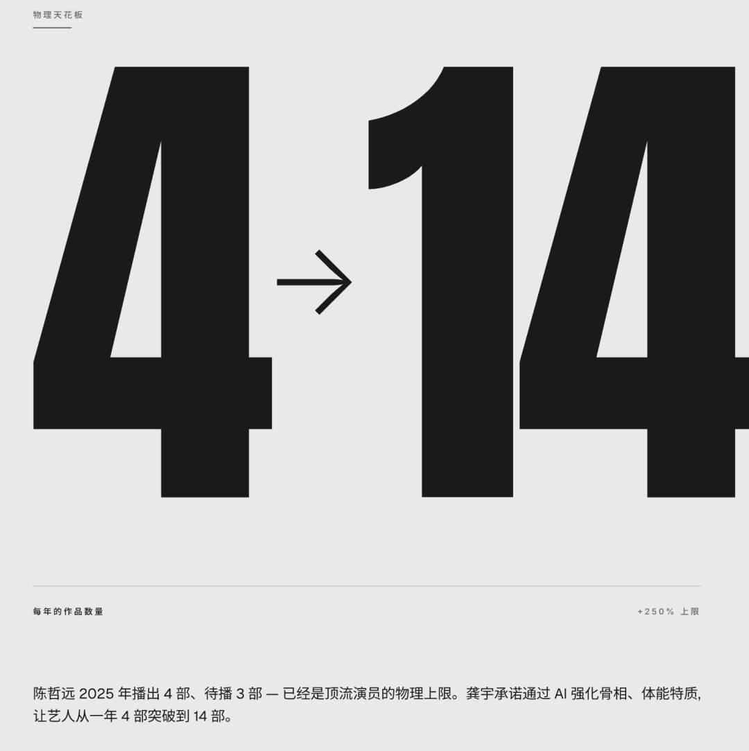 但AI艺人库一旦跑通,演员的价值会被重新定义为「performance token库存」。周迅v1.2数字分身=按token用量计费+平台分账+可同时出现在N部剧里。