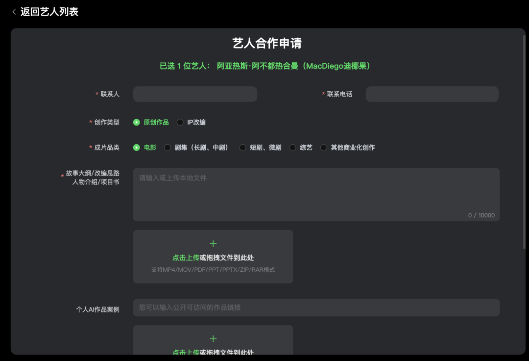 现在,可以很方便地点击某一个位艺人直接通过「申请合作」,填写信息就申请了,在这个过程里需要上传故事大纲以及你之前做过的AI作品: