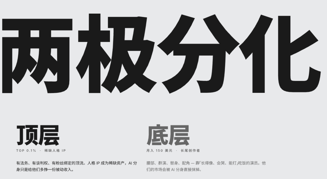 底层是所有没有法务、没有粉丝绑定、靠「长得像、会哭、能打」吃饭的腰部和尾部演员。他们的市场会被AI分身直接抹掉。这是中国版的OnlyFans月入150美元创作者。
