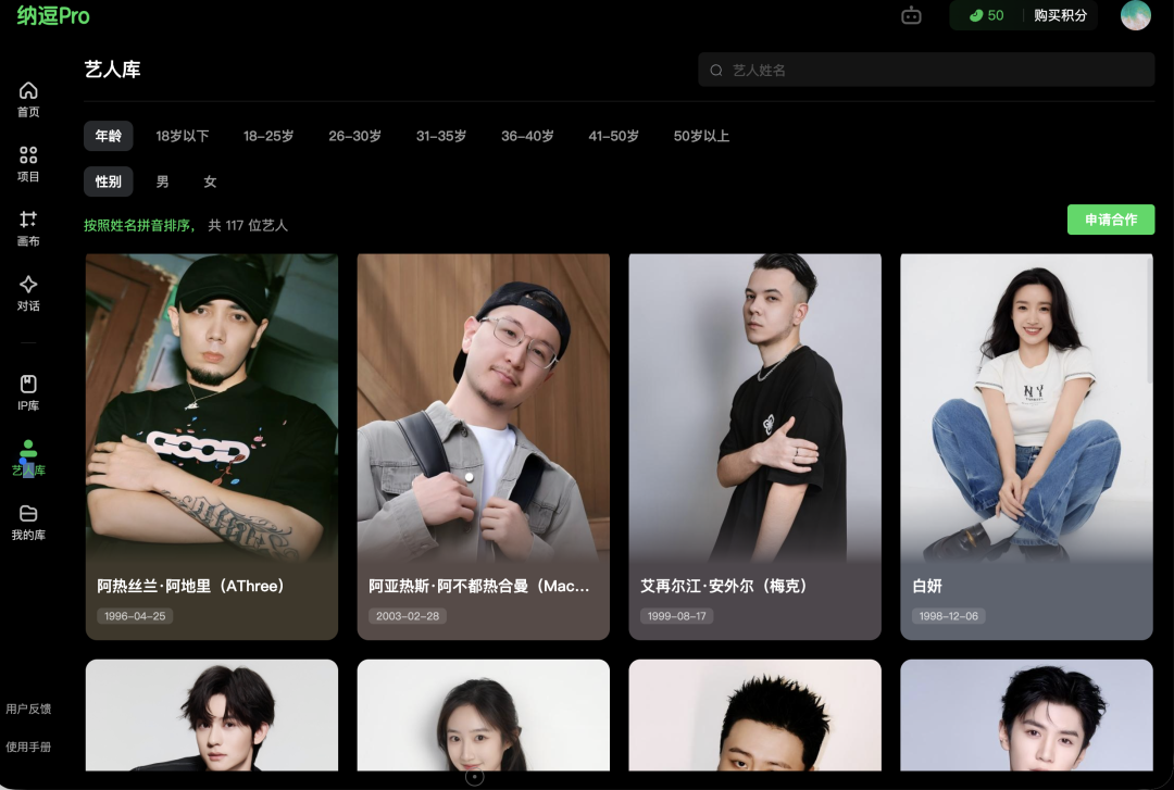 其内部设置了剧本评估、小说转剧本、对话等智能体。有意思的是,我在它的艺人库里发现,里面已经注册了117位艺人,居然还是按照具体年龄排序的(虽然大多数我都不认识...原谅我):