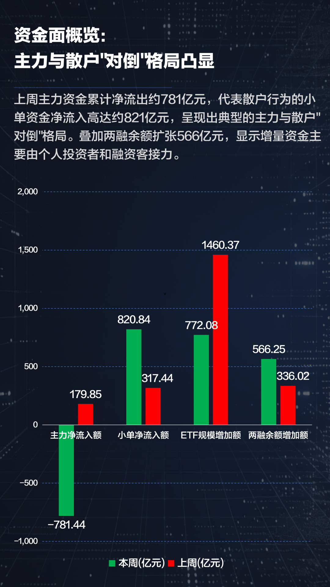 主力资金累计净流出约781亿元,与此形成鲜明对比的是,代表散户行为的小单资金净流入高达约821亿元,呈现出典型的主力与散户"对倒"格局。叠加两融余额扩张566亿元,显示增量资金主要由个人投资者和融资客接力。