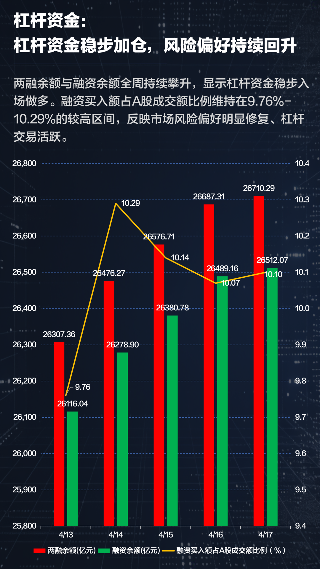 杠杆资金稳步入场做多,两融余额与融资余额全周持续攀升,市场风险偏好明显修复。