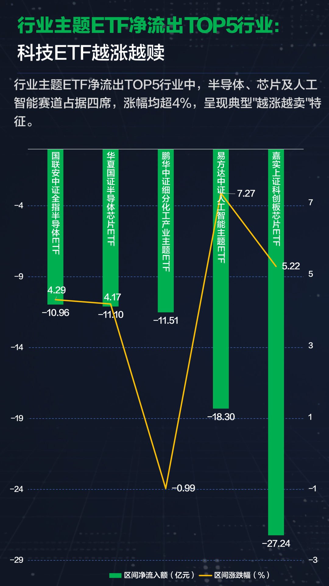 行业主题ETF方面,卫星ETF以22亿元净流入及8.21%涨幅居首,电网设备ETF获19亿元增持;而半导体、芯片及人工智能赛道占据净流出TOP5中的四席,且周涨幅均超4%,同样呈现“越涨越赎”特征。