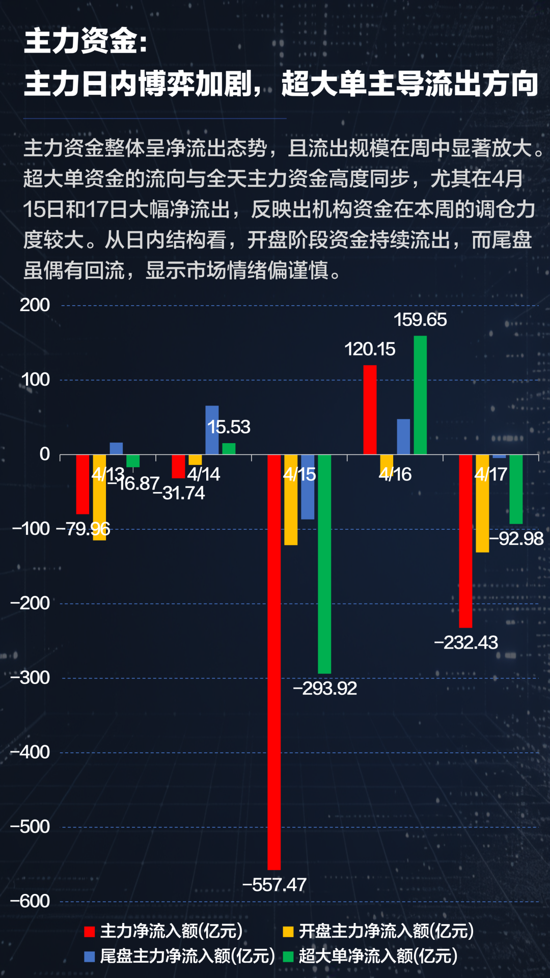 散户资金本周仅4月14日微幅流出,15日单日爆发437亿元净流入(净流入率1.80%)达情绪高点,后半周规模回落但仍保持百亿级流入。