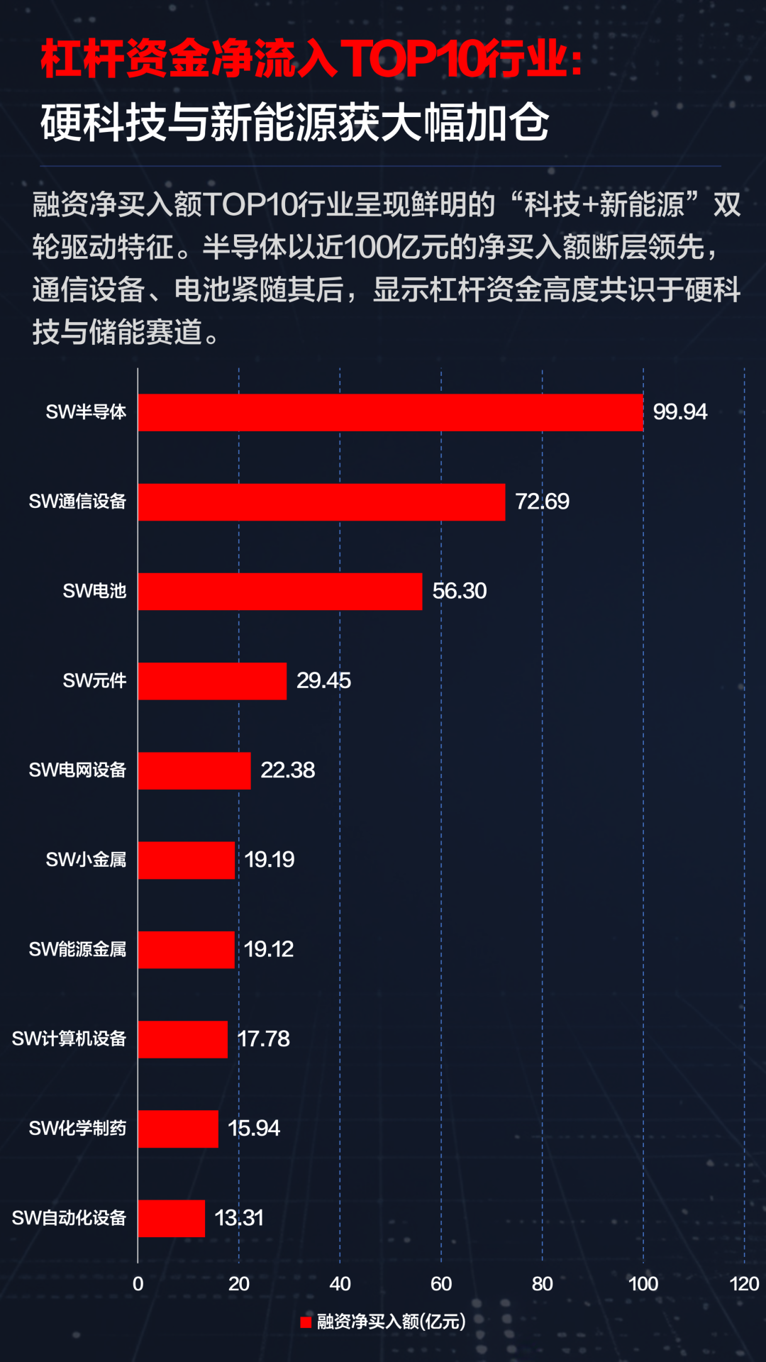 融资净买入额TOP10行业呈现鲜明的“科技+新能源”双轮驱动特征,半导体以近100亿元的净买入额断层领先,通信设备、电池紧随其后,显示杠杆资金对硬科技与储能赛道高度共识。