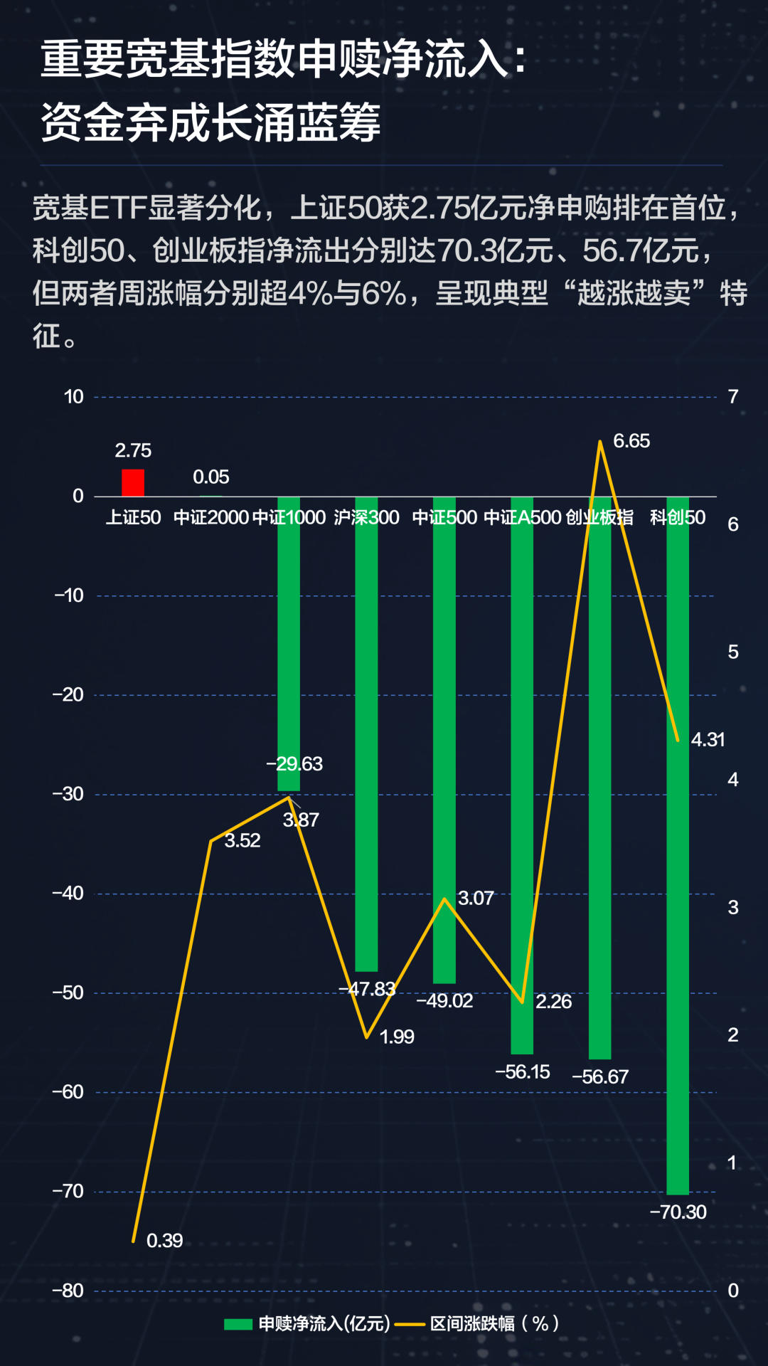 宽基指数ETF内部显著分化:上证50获2.75亿元净申购排在首位,科创50、创业板指净流出分别达70.3亿元、56.7亿元,但两者周涨幅分别超4%与6%,呈现典型“越涨越卖”特征。