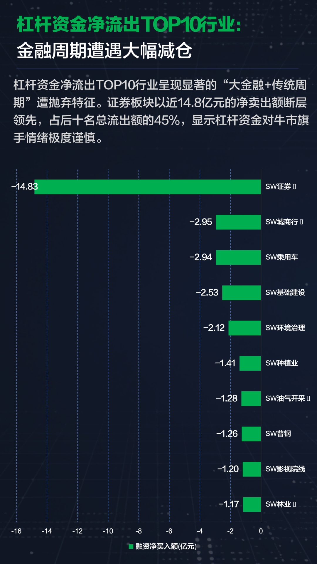 融资净流出TOP10行业则呈现“大金融+传统周期”遭抛弃特征,证券板块以近14.8亿元的净卖出额居首,反映杠杆资金对“牛市旗手”情绪谨慎。