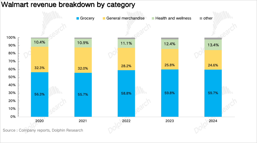 一方面,商品结构上,从下图可以看到沃尔玛的食品杂货占到了60%,其余部分由利润弹性更高的日用百货、健康保健类商品构成,要知道食品杂货作为刚需、高频、低促销依赖的品类,本身就具备极强的盈利稳定性,是沃尔玛天然的“毛利稳定器”。