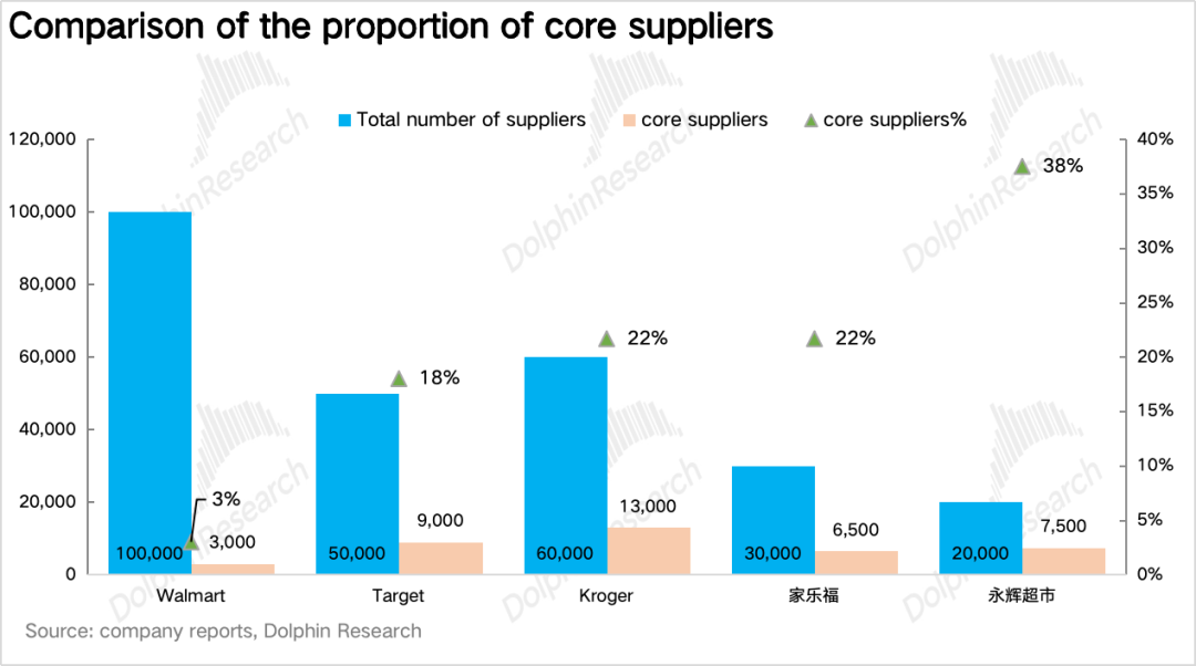 虽然沃尔玛在全球有10w+供应商,但通过多年的精简和淘汰,沃尔玛的核心供应商当前实际仅3000家左右(占比3%),贡献了沃尔玛90%-95%的全球采购额。而从下图可以看到多数同行核心供应商占比普遍在10%-30%之间。