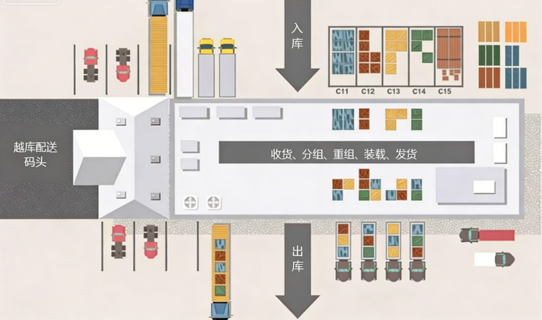 仓储端,相较于传统商超“先囤货、再发货”模式,沃尔玛通过最具标志性的创新——交叉配送(Cross-Docking)实现了商品“零库存中转”,从根本上降低了仓储、资金占用与损耗成本。