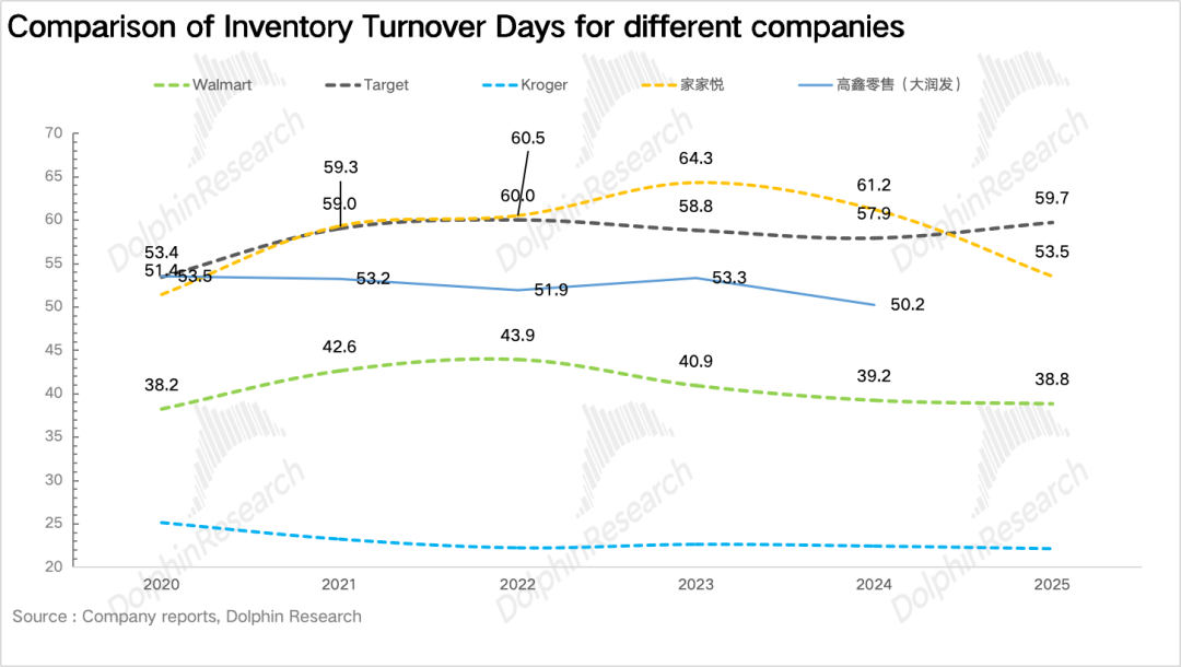 而从下图可以看到,沃尔玛在SKU超14万的全品类覆盖下,仍能将存货周转天数稳定在39天左右,显著优于SKU更少的Target、家乐福及中国本土超市,真正实现了高复杂度下的极致效率。