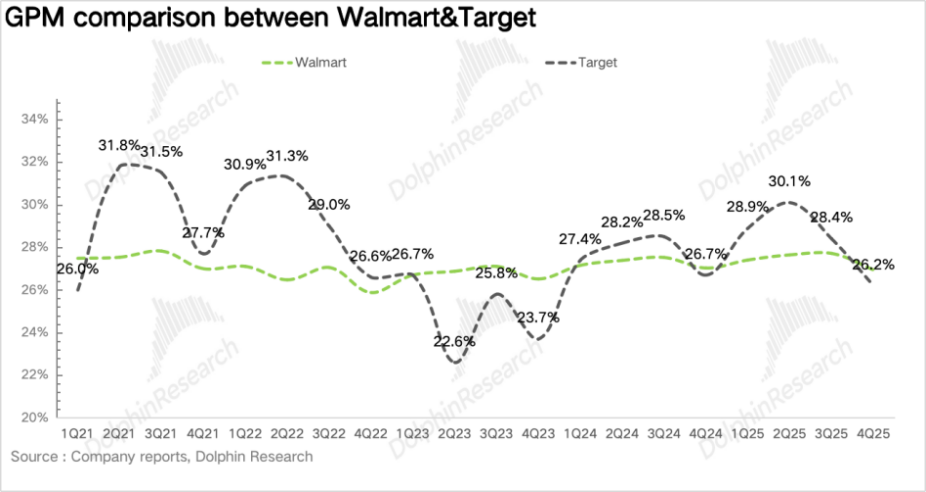 而同样是美国综合零售商的Target食品类占比仅为23%,非食占比高达77%,可选消费占比过高会导致毛利更容易受到经济周期与消费季节性的双重影响。