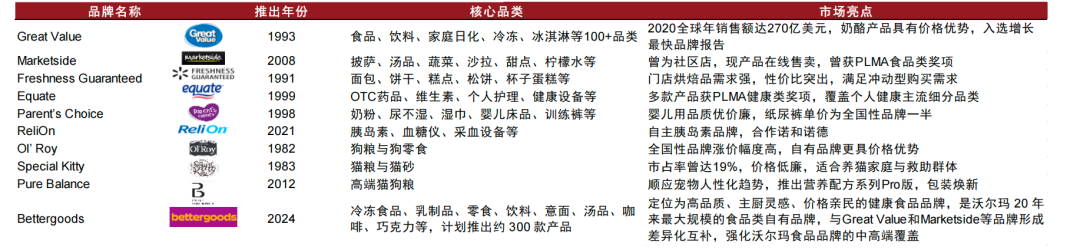 阶段三:“价值引领”时代:如果说前两个阶段沃尔玛自有品牌还依赖于大牌的动作,近两年的沃尔玛已经开始创造和引领消费需求。2024年春季沃尔玛推出了全新食品自有品牌Bettergoods,这也是是沃尔玛二十年来规模最大的食品自有品牌发布。