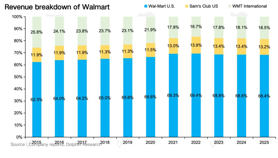 从公司财报的披露口径来看,沃尔玛的营收分为沃尔玛美国、山姆会员店(美国)以及沃尔玛国际三大板块,其中沃尔玛美国和山姆会员店(美国)构成了公司的美国本土业务,截至2025年底,从下图可以看到沃尔玛的美国本土业务贡献了总营收的82%,是公司业绩的核心基本盘。
