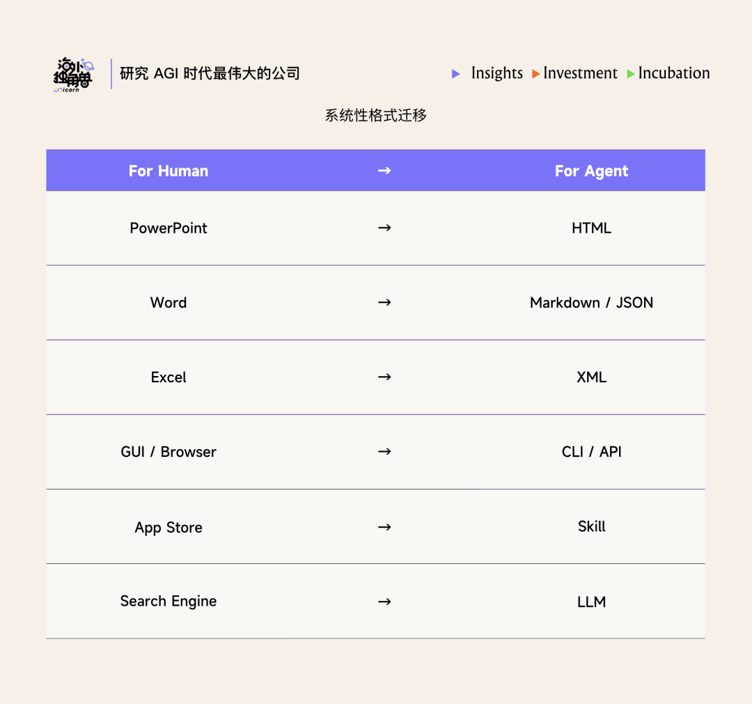 左列的每一项都是为了让人类更容易操作信息,而右列的每一项都是为了让Agent更容易操作信息。这是信息表示形式的迁移,一旦Agent成为主要的信息消费者,信息的天然形态就要改变。