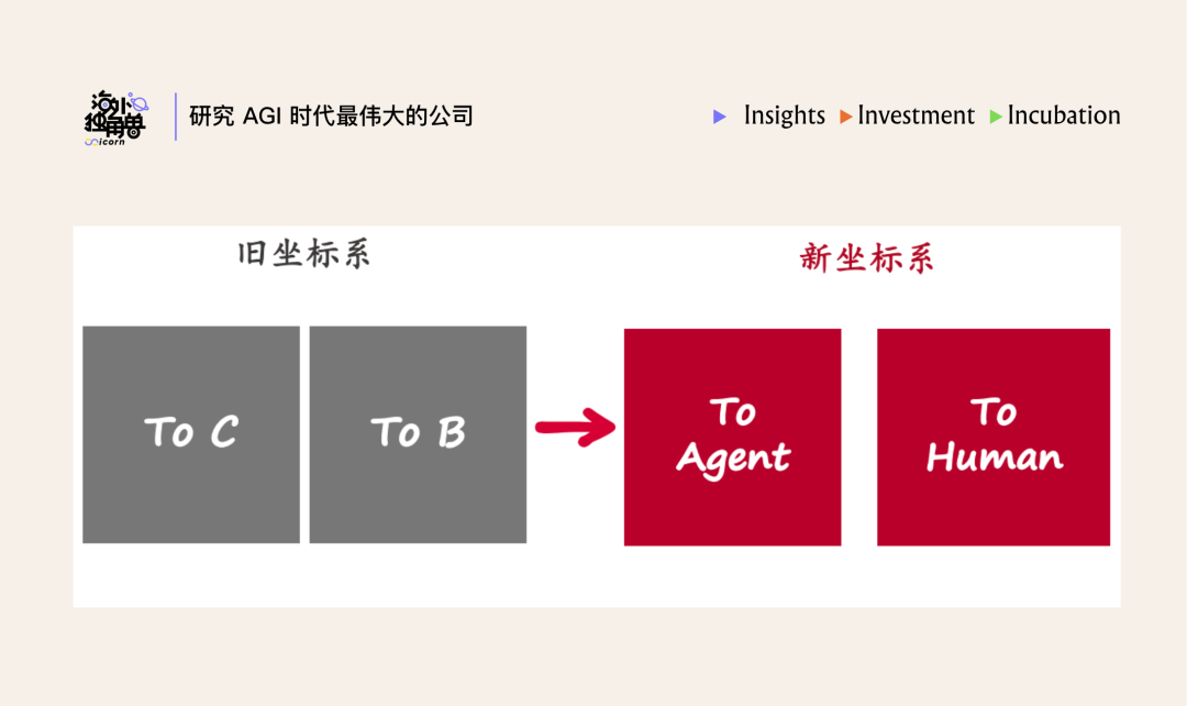 To Agent的定义:Agent本身成为生产者和消费者。它自主搜索、调用API、开启runtime、做采购决策、完成支付。在这里,商业逻辑的主体发生了物种替换。