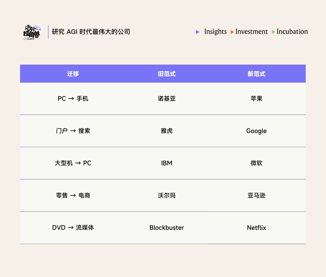 每一次,旧范式领先者都拥有数量级更大的用户基础、更强的品牌、更厚的现金储备。每一次,最终赢家都是从零开始、为新范式重新设计产品和组织的公司。