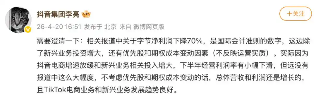 图注:报道后,抖音副总裁对字节跳动的净利润下滑做了回复。