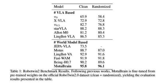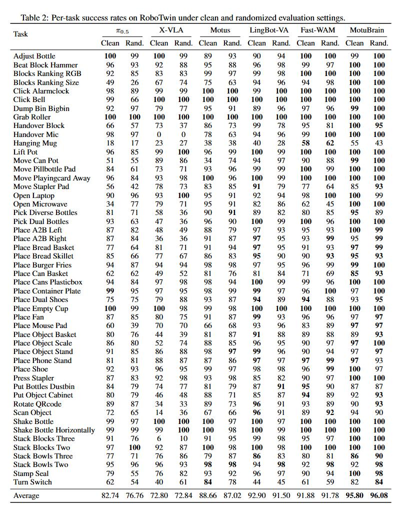 而在更偏任务执行的RoboTwin上,这种优势被进一步放大。面对50个任务、两种不同环境设置,MotuBrain的平均得分达到96.0,显著高于第二名的92.3,领先幅度几乎等同于第二名到第五名之间的差距。