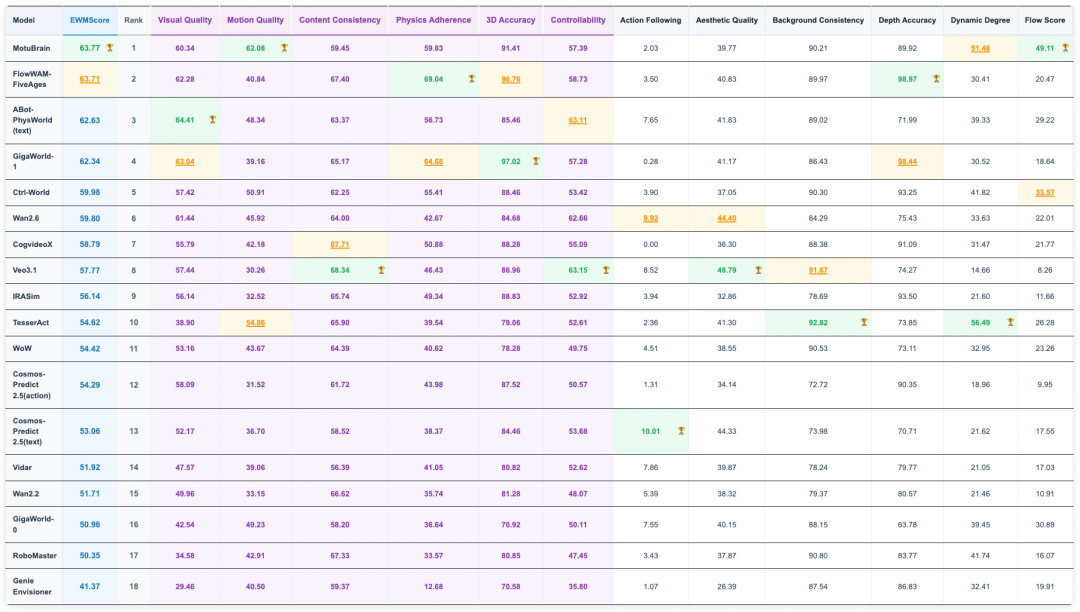 在WorldArena上,MotuBrain以63.77的总体EWM Score位居第一,从结果来看,其表现超越了高德的ABot、极佳GigaWorld-1等模型,并在Motion Quality、Flow Score、Motion Smoothness等多个关键运动维度上全面领跑。