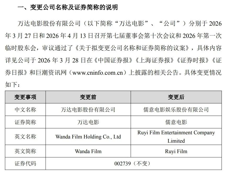 2026年3月27日,万达电影曾预告称,公司即将更名。不久后的4月19日,靴子落定,万达电影在新公告中正式宣布更名为儒意电影娱乐股份有限公司。昨日起,该公司的证券简称已变更为“儒意电影”,证券代码“002739”则保持不变。
