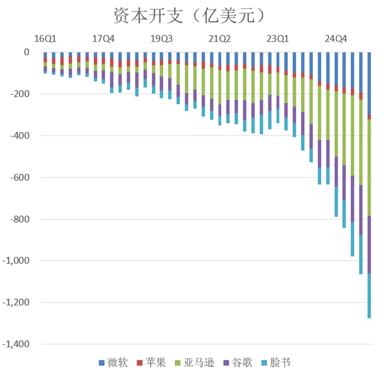 我们知道,早在十几年前,微软、苹果、谷歌、亚马逊和Meta(合称FAAMG)就已经建立了非常成熟的商业模式。它们各自占据了互联网产业的一个角落,挖好了护城河,建立了垄断王国。在这些垄断王国之内,它们用不着多少资本开支去推动技术进步,相互之间也不搞什么你争我夺,因此可以躺着赚钱。投资术语叫做自由现金流极其充沛。