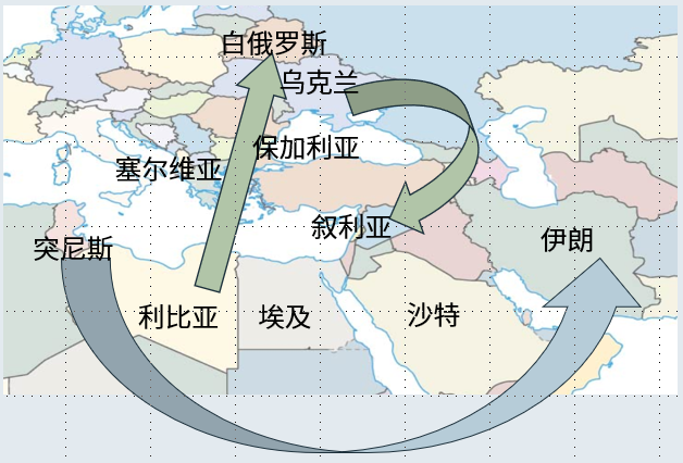 古人云:不平则鸣。哪里有怨气,哪里就有破坏。所以在2010年,突尼斯首先暴发骚乱。然后传导到利比亚和埃及。这些国家的政权相继倒台,史称阿拉伯之春。当时的战略研究普遍认为,这场风波还将向东扩散,席卷叙利亚、约旦、沙特,最终到达伊朗。