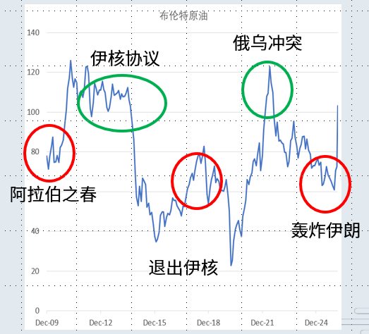 2022年俄乌战争暴发,油价再次上攻120美元,美伊冲突暂时休止。再然后中国的新能源技术海量应用,油价再次回落至80美元以下。直到2026年3月,眼下的伊朗事件暴发。