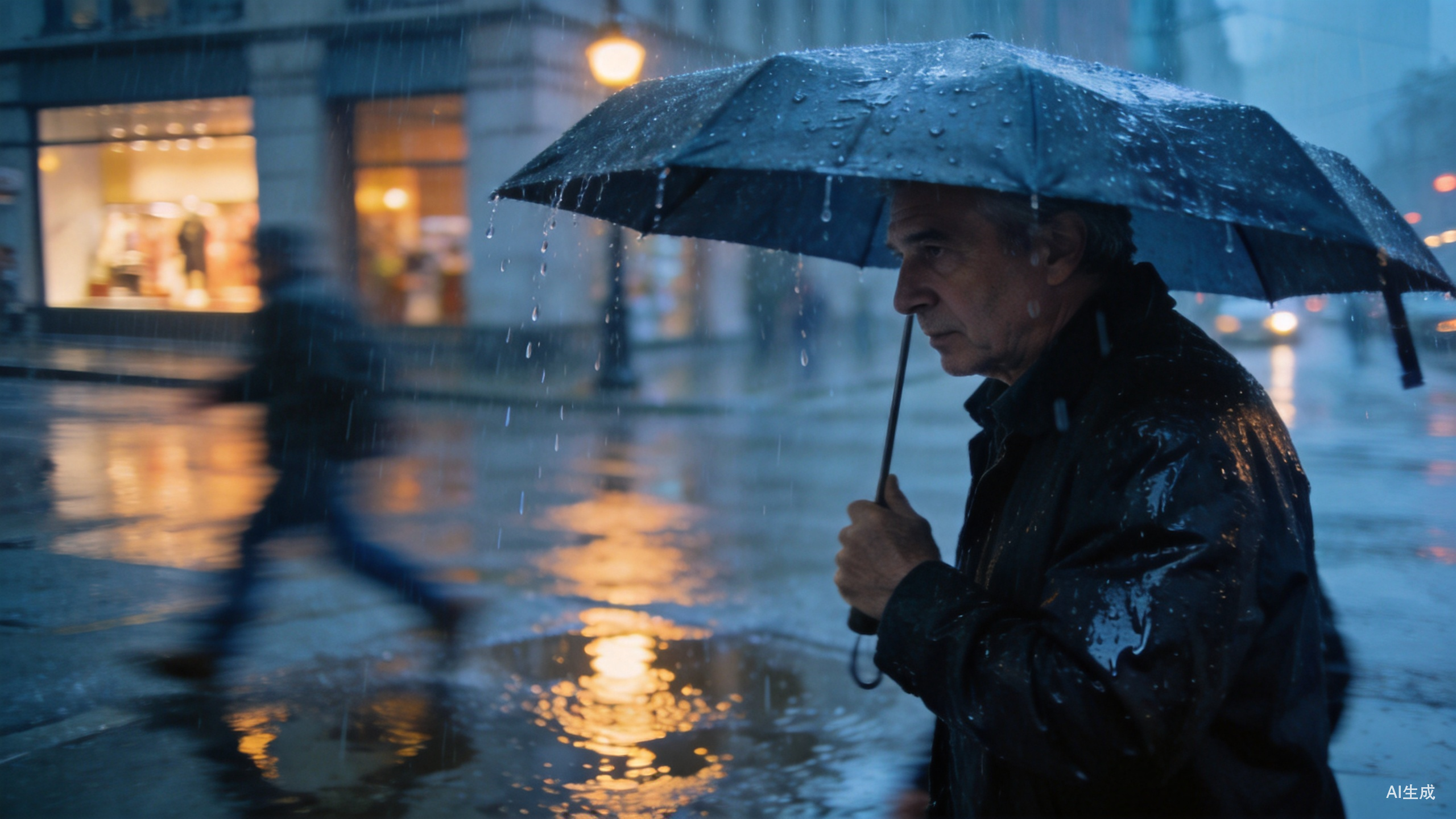 结果两边伞面上的雨水哗哗往他身上流,举伞僵硬姿势,还被网友形容“像在拉公交车的把手”。