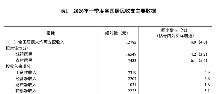 据统计局数据,2026年一季度城镇居民人均可支配收入16549元,扣除价格因素,实际增长3.2%;同期,农村居民人均可支配收入7433元,扣除价格因素,实际增长5.4%。