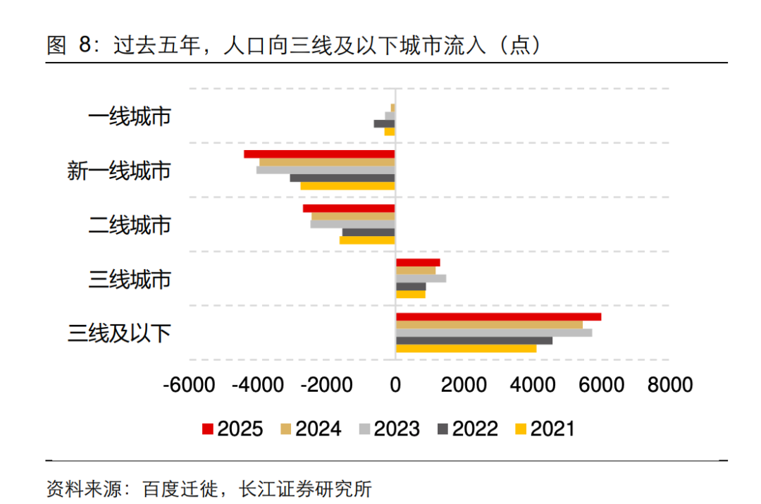 长江证券援引百度迁徙数据,最近5年,人口明显流向三线及以下城市。