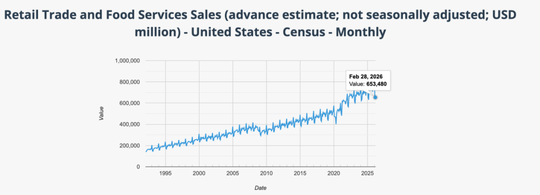 4月1日,美国商务部普查局发布零售先行报告,显示2026年2月,美国消费品零售总额(未经季节性调整)为6534.80亿美元,同比增长3.6%。