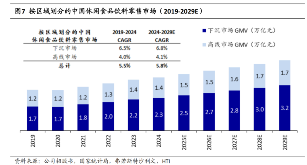 兴业证券的研究显示,休闲零食领域下沉市场的增速高于高线城市。预计到2029年,下沉市场的规模接近高线城市的两倍。