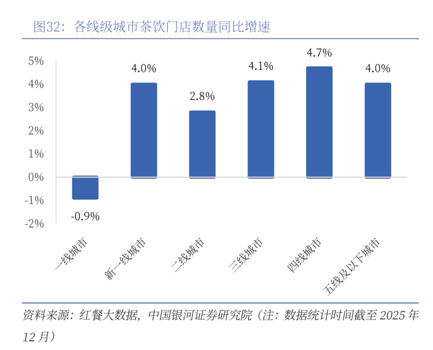 以热门赛道奶茶为例,银河证券援引红餐大数据的报告,三线以下城市扩张速度最快。