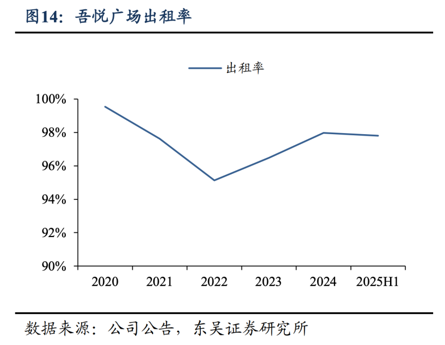 2020年至今,吾悦广场的出租率一直维持在95%以上,2025年半年度更是接近98%。
