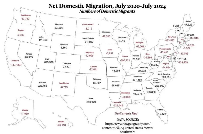 这场逆城市化浪潮,最受益的是德克萨斯和佛罗里达等地,最受损的是加州等地区。