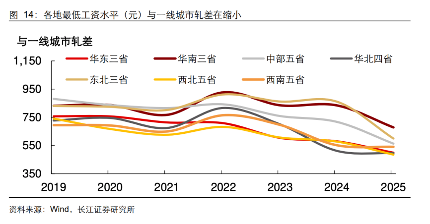 另据长江证券统计,随着各地基本保障的完善,全国各地的最低工资差距和一线城市明显缩小,西南、西北、中部缩小尤为明显。