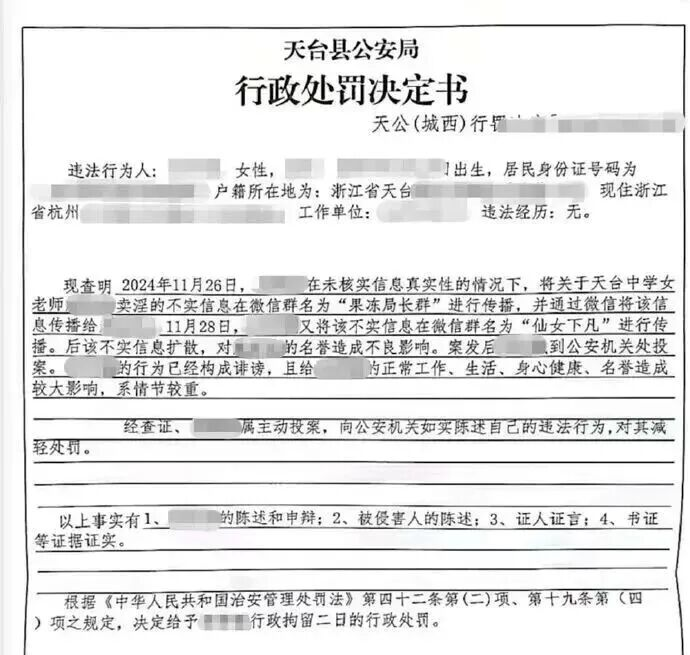 2025年10月,浙江一名女教师林某(化名)因在三人的微信群及私聊中传播未经证实的“女教师卖淫”黄谣,而被天台县公安局行政拘留两日。此事在最初曝光时就引发众议,私人仅因在私密的微信群中调侃、八卦就会违法或涉罪,与公众朴素的法律直觉之间出现巨大罅隙。案发后,当事人林某不服向法院提起行政诉讼,请求撤销处罚决定,一审法院驳回了其诉讼请求。