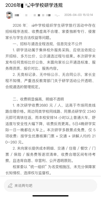 “同类学校同线路、同景点研学仅2340元即可高铁往返,而本次研学收费2680元,还要坐14个小时的绿皮火车,且研学多数景点免费...”