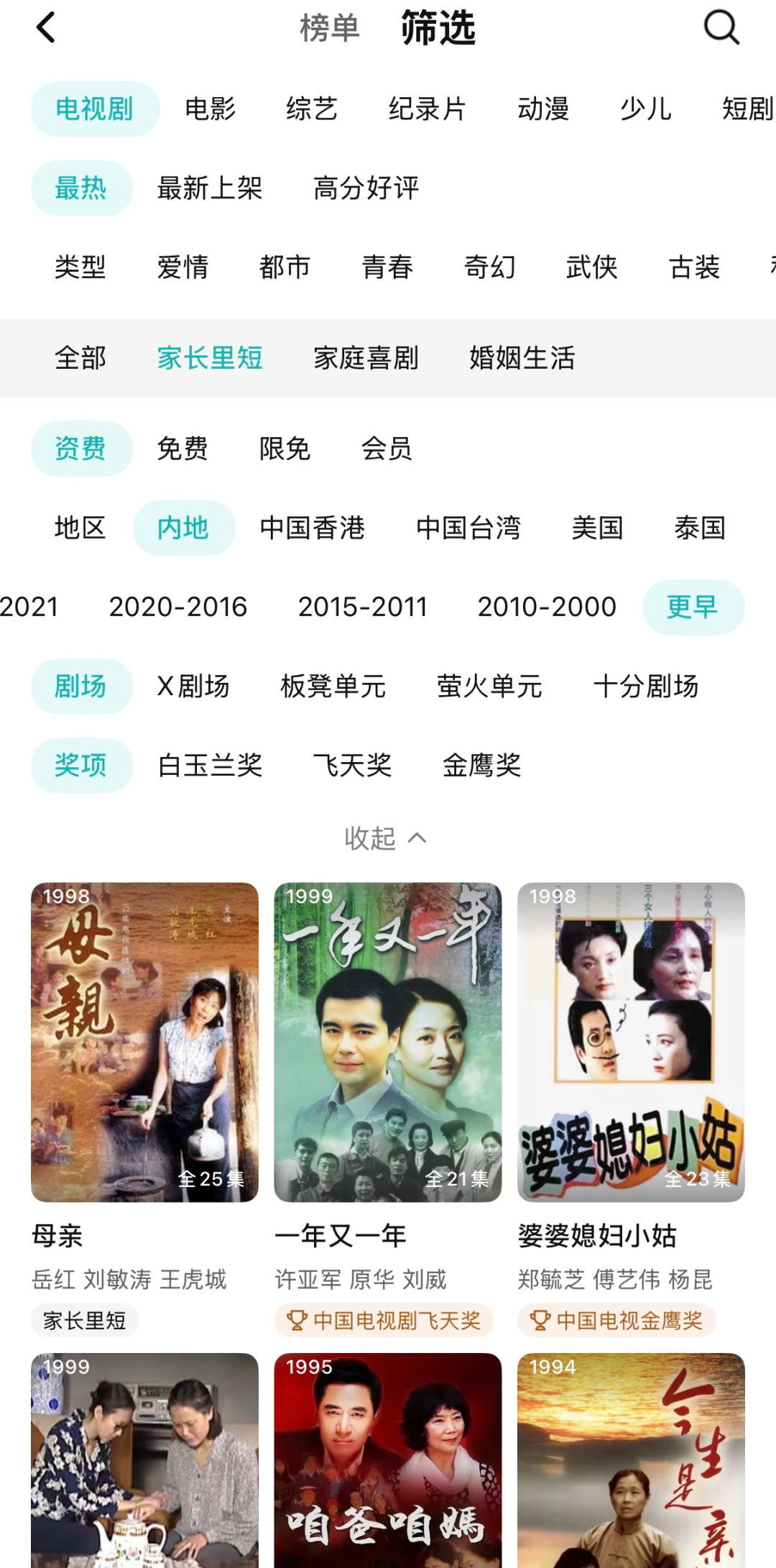 打开视频软件,忽略首页的一切推荐,点击全部剧集,地区选择“内地”,类型选择“家庭/农村”,年份选择“更早”,然后在海量的内容库中淘宝。