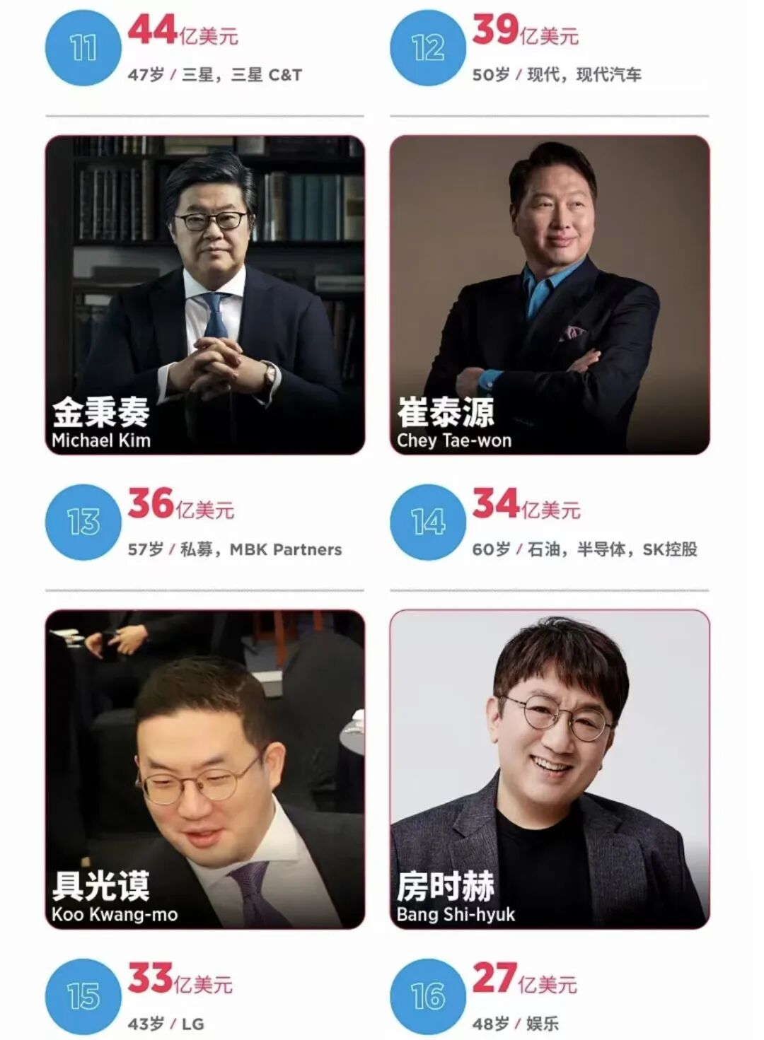 2021年,福布斯发布韩国富豪榜,房时赫以27亿美元身家位列第16位。到2022年,他的财富进一步增长至33亿美元,排名提升至第12位。