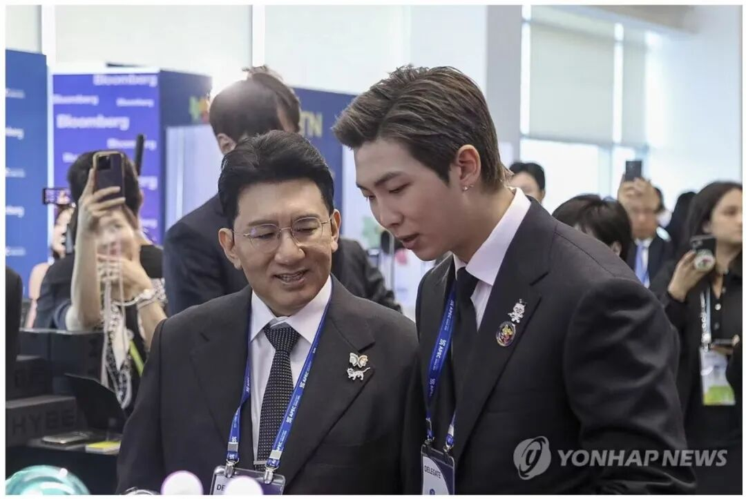 ▲房时赫(左)与防弹队长RM HYBE/来源:韩联社