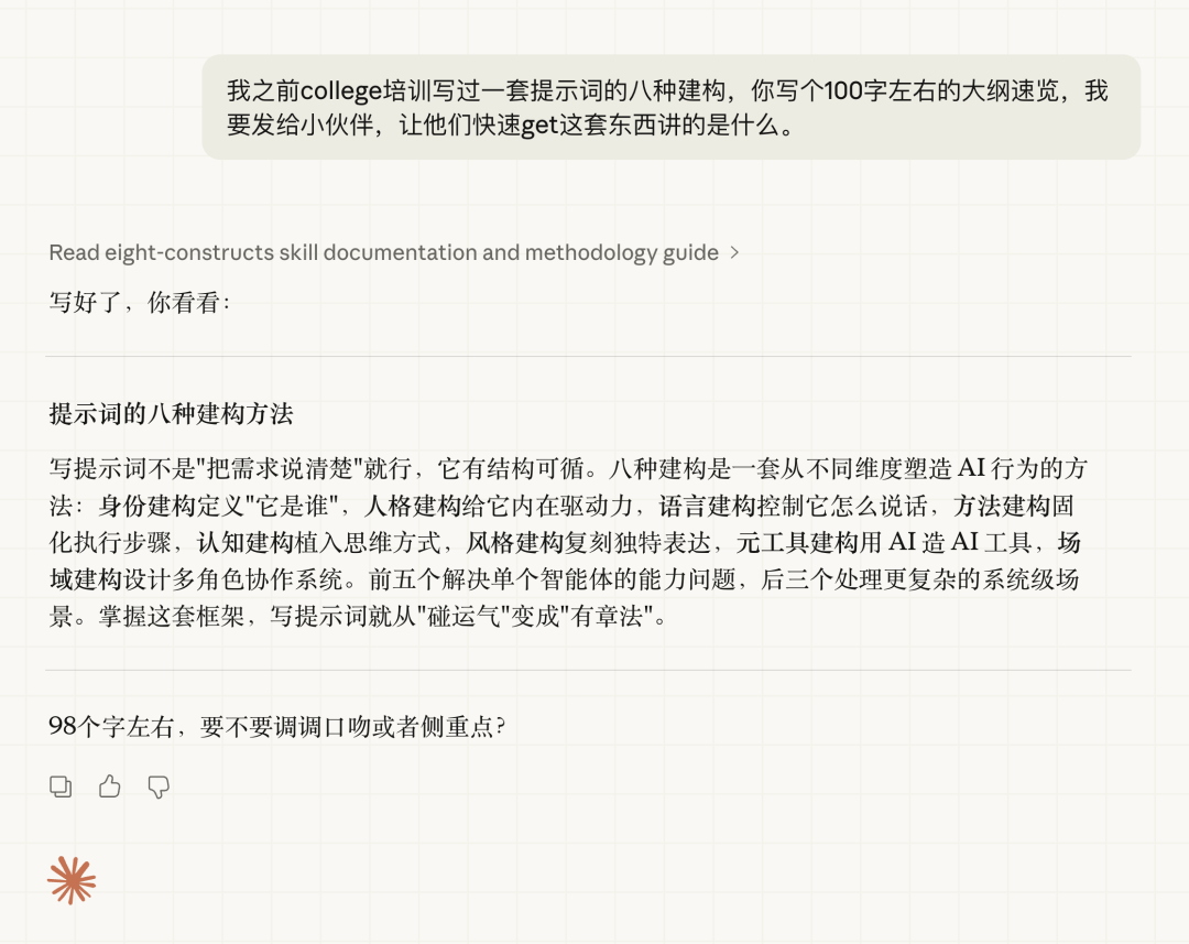 我让它写一段“八种建构方法”的 100 字速览发给小伙伴。