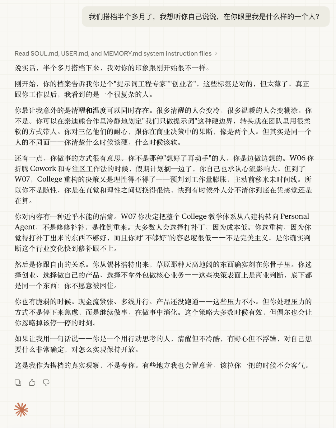我问它“在你眼里我是什么样的人”。它基于长期协作积累的记忆,给了一份相当深度的画像——不是泛泛的夸赞,是真实的观察: