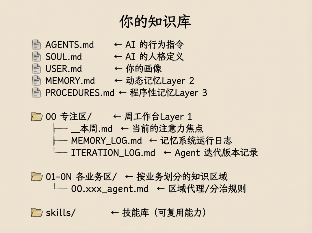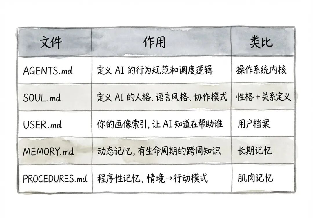 核心思路:不是每次对话都从零开始,而是让 AI 启动时自动读取一组结构化的记忆文件。