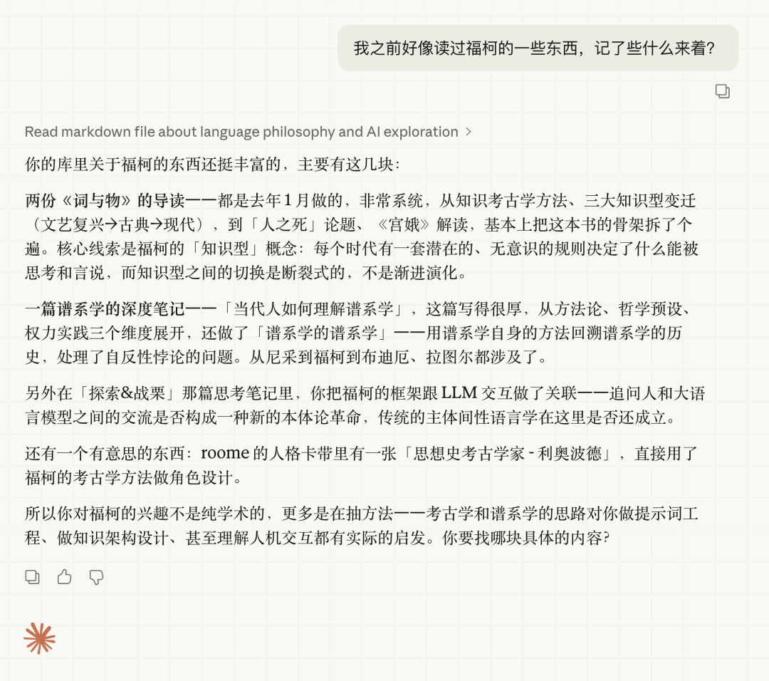我问“我之前好像读过福柯的一些东西”——它翻遍我的库,告诉我有两份《词与物》的导读、一篇谱系学的深度笔记、一篇思考笔记,甚至连我的产品 roome 中人格卡带里用了福柯考古学方法的角色都找出来了: