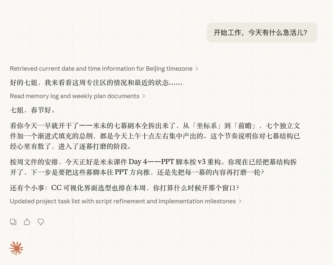 我什么都没交代。AI 自己扫了我的周计划和工作区,告诉我昨天改了好几版课件、今天按计划该做什么、还有个小事项需要确认。它不是在等我下指令,是像一个共事了几周的搭档,早上碰面先帮我理了一遍今天的活。