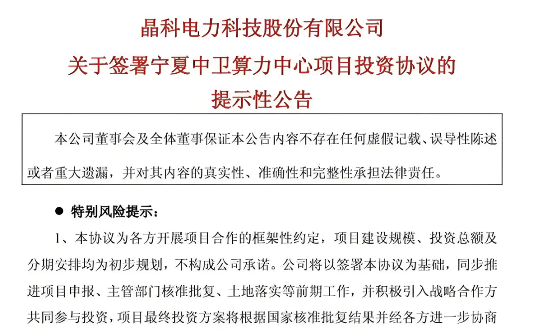 近日,晶科科技公告,拟投资245亿元在宁夏中卫建设1GW算力中心项目,计划分三期建设,部署机柜约5万架,一期投资100亿元,二、三期分别投资60亿元和85亿元,最终实现总IT功率1GW,规模跻身国内超大型智算基地行列。