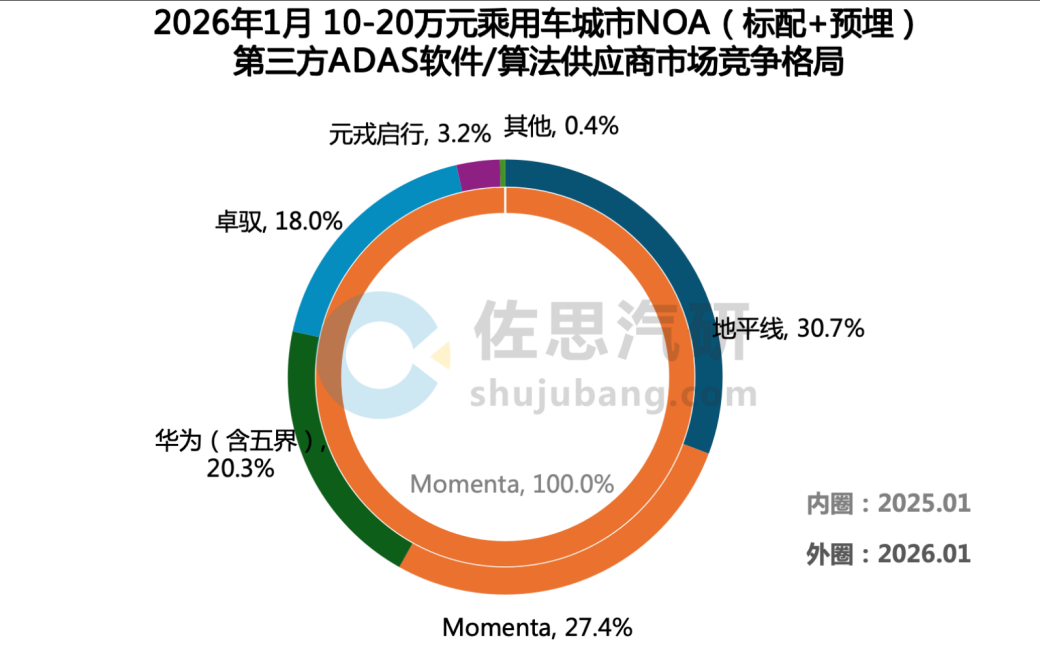 在市场竞争格局上,根据中国汽车工业协会发布《2025城市NOA汽车辅助驾驶研究报告》,2025年1—11月,Momenta城市NOA搭载量达41.44万辆,在第三方供应商市场中占比约61.06%,行业领先。但进入2026年,这一优势似乎已经减弱。