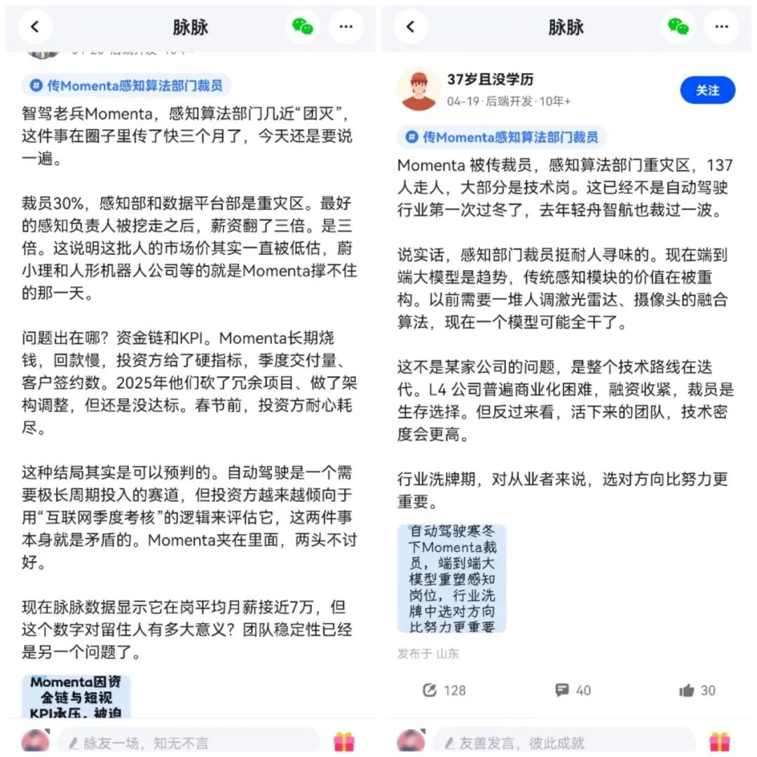 据传,此次减员或重点波及感知算法部门、数据平台部等部门,其中感知算法部门“137人走人”,大部分是技术岗。此外,Momenta感知算法团队负责人曝出被“三倍薪资”挖角离职。